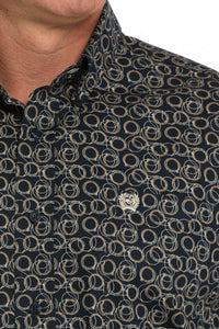 Win the next roping Jackpot in your new lucky shirt from Marshall's! Or, at least look good trying with this classic dark navy printed cotton weave with an allover rope print. Design features include an open left front pocket, embroidered CINCH logo, and navy buttons.