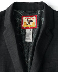 Heat up your downtown look wearing a handsome sport coat like this NEW for fall charcoal polyester stretch wardrobe star engineered by CINCH. This sporty outfit necessity promises to polish your favorite jeans and button down look with its printed satin stretch lining, tortoise buttons, and a woven logo label.