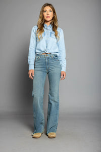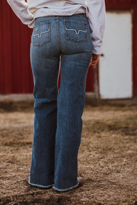 A high-rise stovepipe jean with a wide leg and raw hem, the Olivia is the perfect everyday jean. Made from our innovative tri-blend denim for maximum wearability and rebound, this lightweight jean is accented with our iconic Longhorn logo on both back pockets.